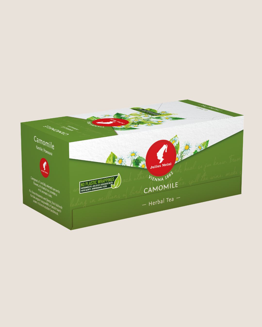 Julius Meinl biljni čaj Camomile – Ovaj biljni čaj sastoji se od pomno odabranih cvjetova kamilice. Odlikuje se blagim aromatičnim okusom te ima pozitivno i umirujuće djelovanje. Vrijeme pripreme: 5-7 min